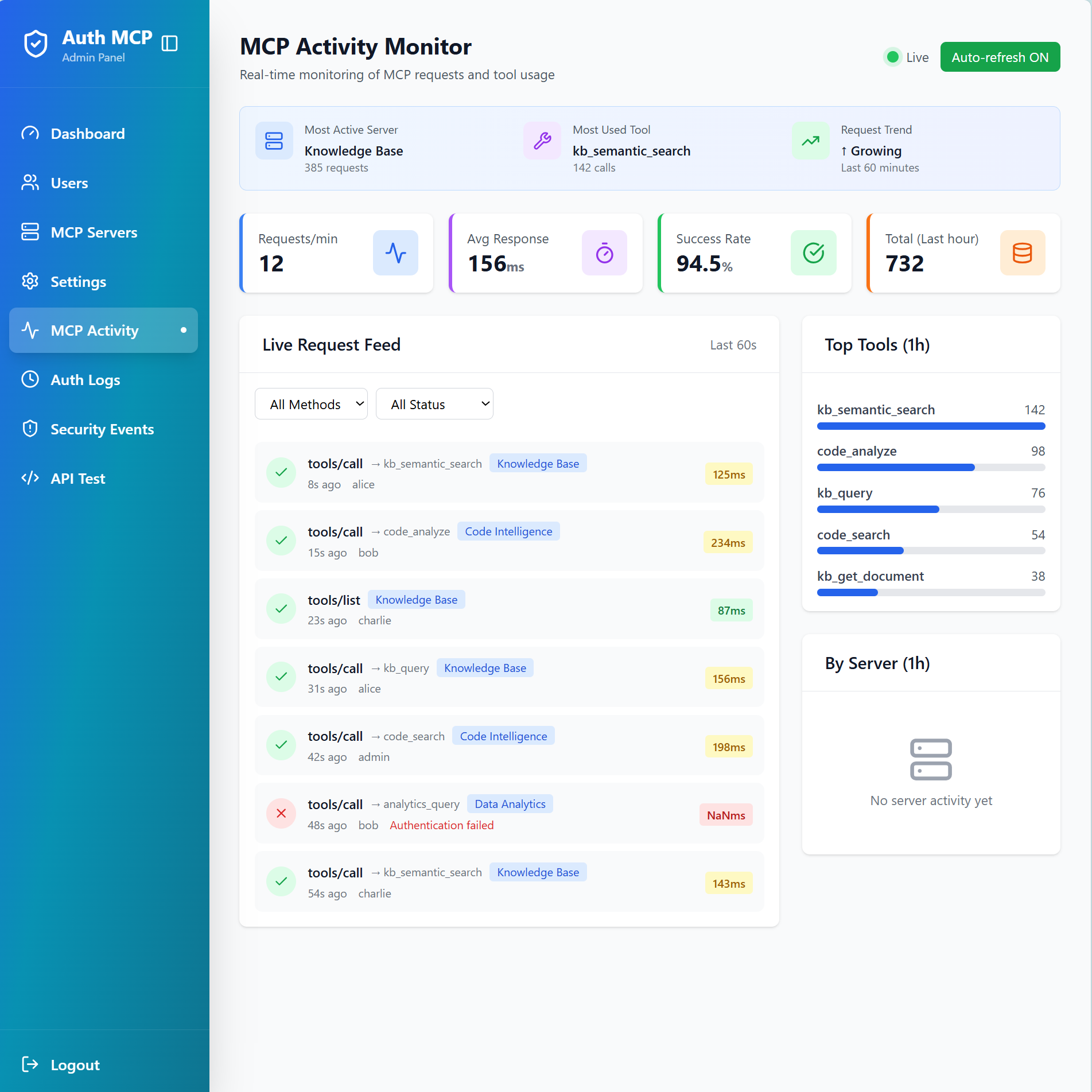 - Live MCP Activity Monitor - Real-time request feed with auto-refresh